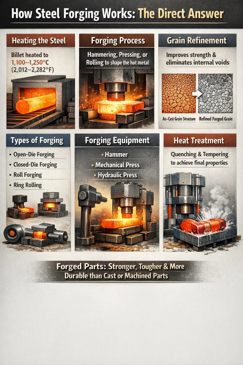Steel forging is the process of shaping steel by applying compressive force — either through hammering, pressing, or rolling — while the metal is heated to a temperature that makes it plastic and workable but not molten. The result is a part with superior mechanical properties compared to cast or machined components, because the forging process refines the internal grain structure and eliminates internal voids.