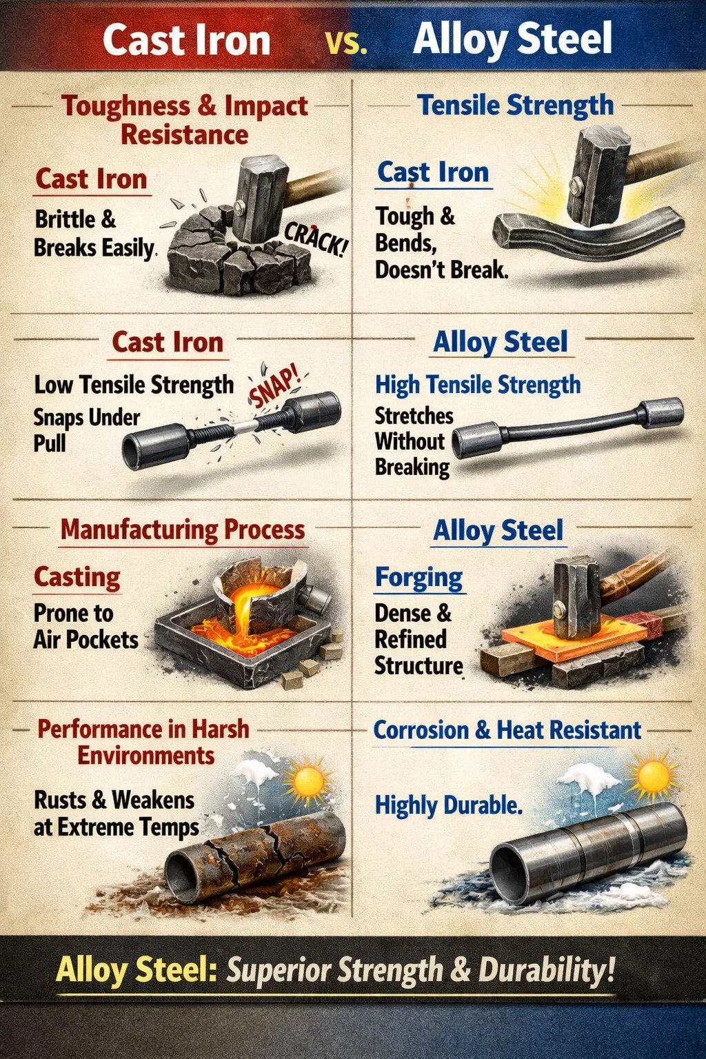 Alloy steel is generally stronger and more durable than cast iron, especially when subjected to impact, tension, and heavy pressure. While cast iron has its strengths in certain specific applications (such as making pots or machine tool bases), alloy steel is the superior material in terms of overall performance.
