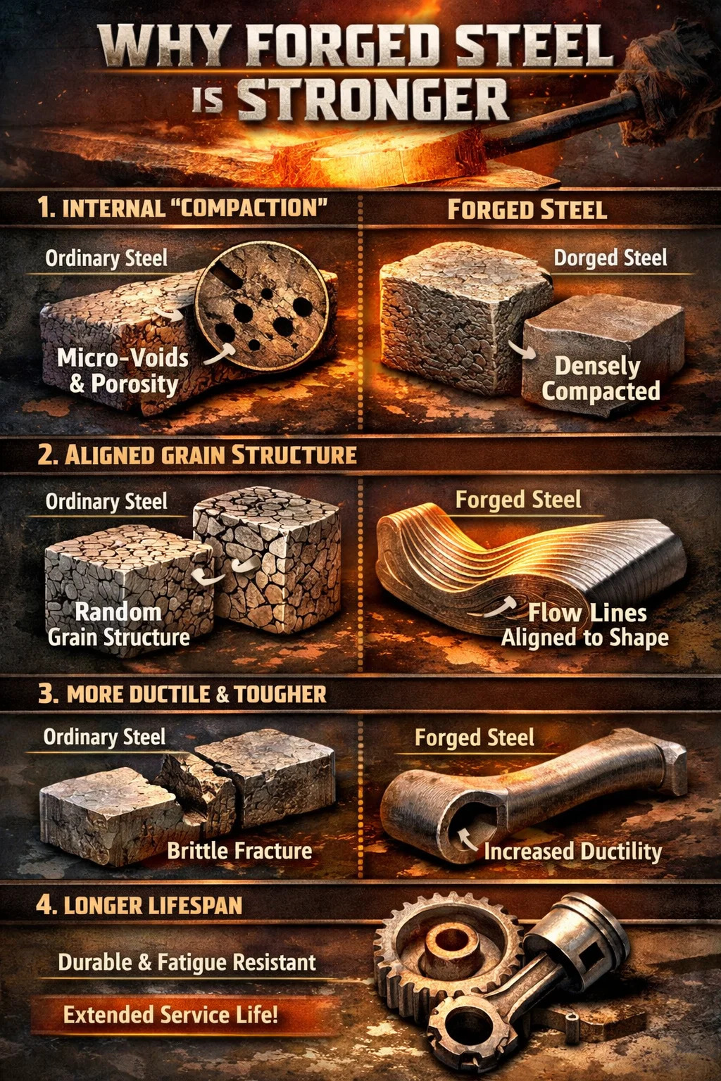 Forged steel: Under immense pressure, these small pores are completely flattened and welded together, making the entire piece of metal as dense as a solid block. Without internal defects, the part is naturally stronger.